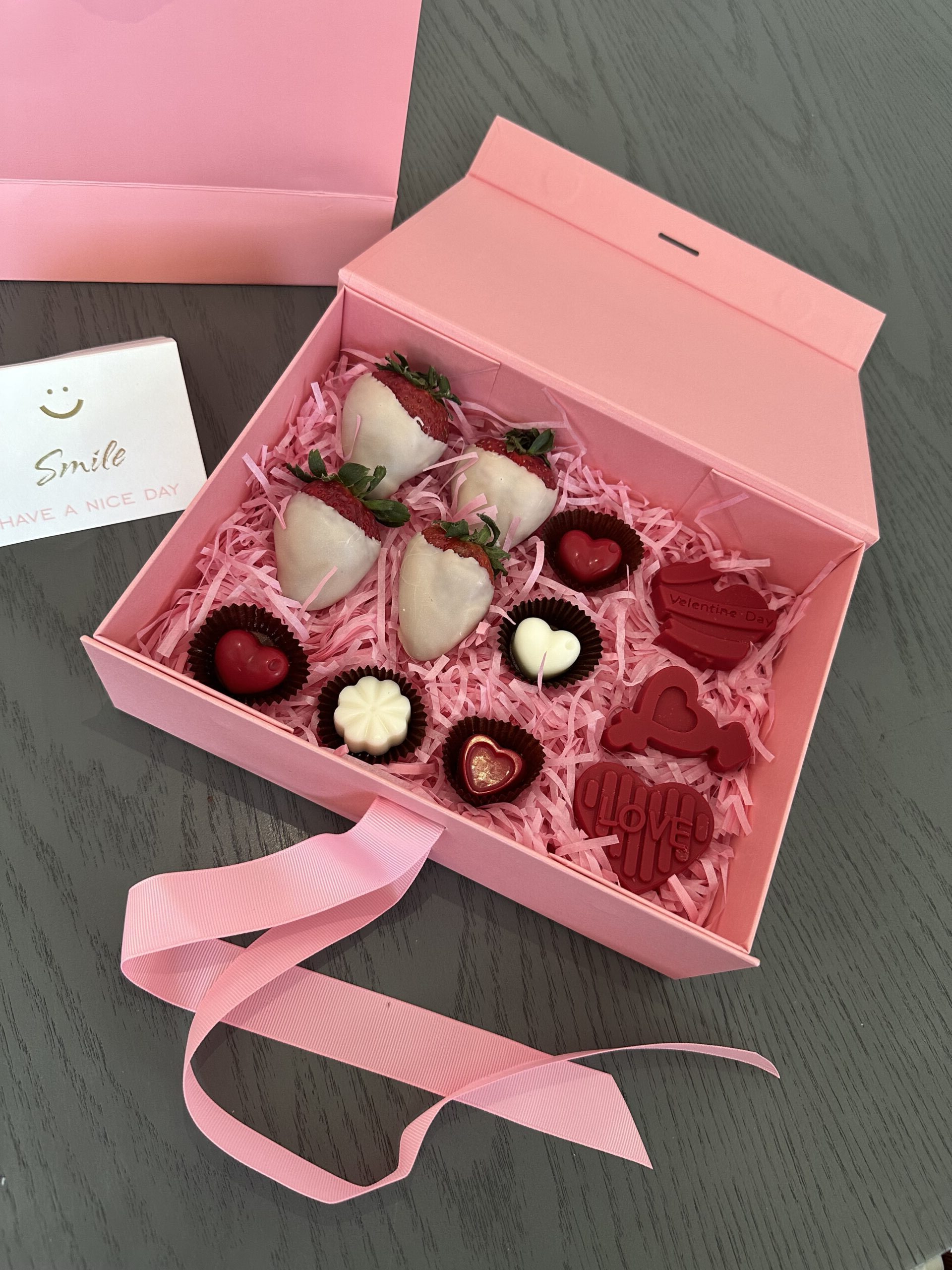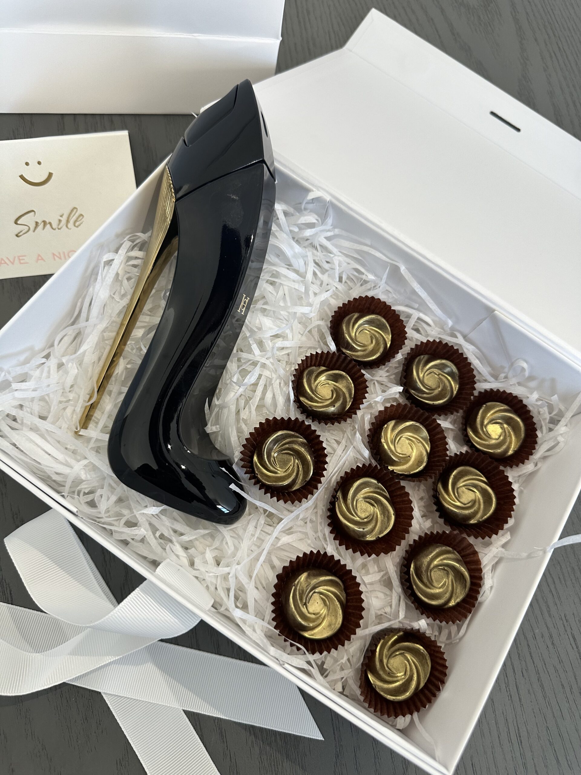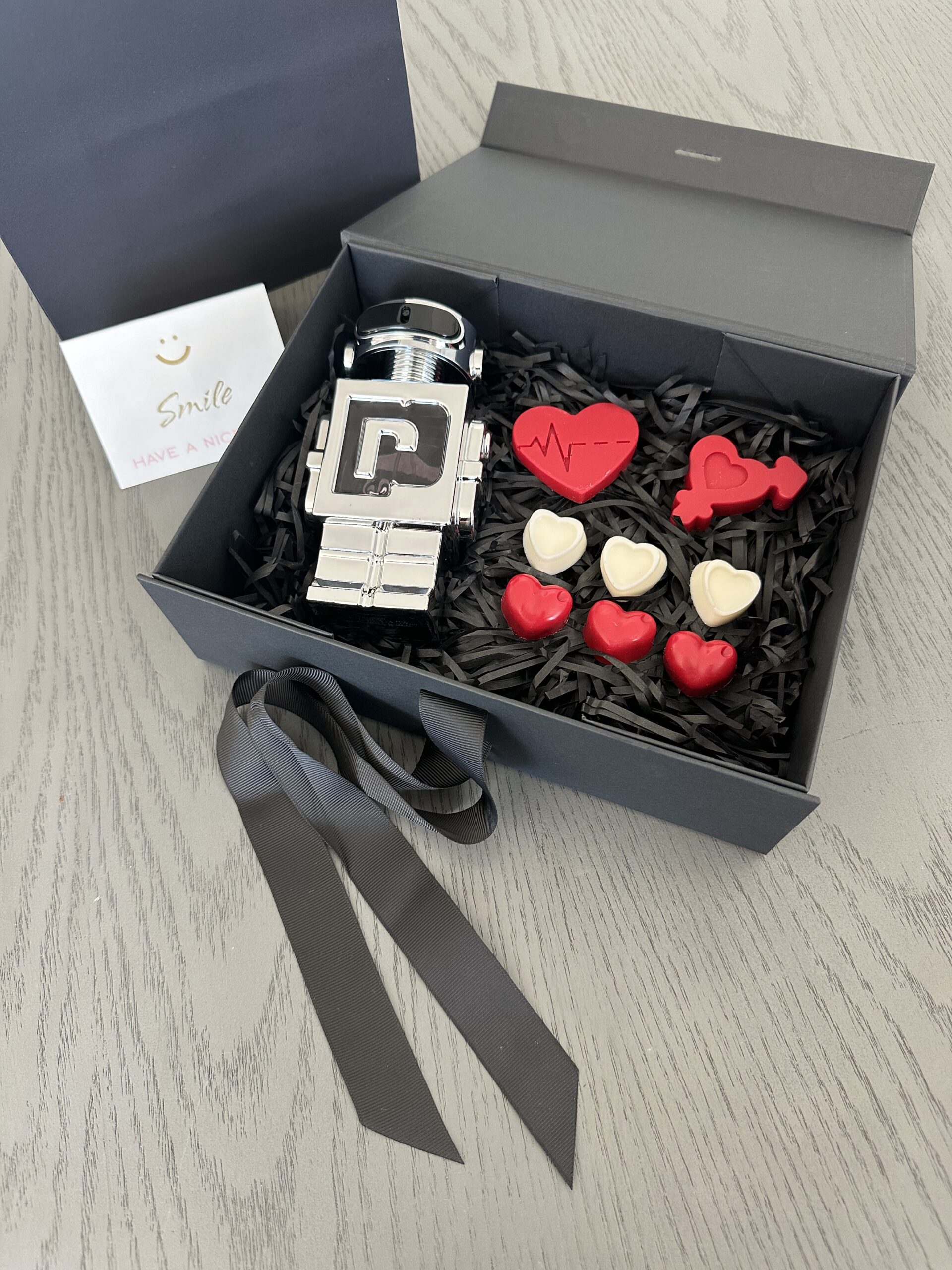 Bolsa color negro con caja imantada para un cierre perfecto. En su interior contiene 8 chocolates de cacao mexicano premium, tarjeta personalizada con el mensaje que deseas incluir y fragancia para dama o caballero (Paco Rabanne Phantom para Caballero o Carolina Herrera Good Girl para Dama) o una mini botella (Champagne Moët & Chandon, Whiskey Jack Daniels o Whisky Chivas Regal)